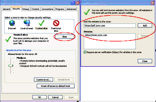 Add https://www.zynx.com to the trusted site list to avoid issues that may occur when trying to print or export content. Exports to XML, RTF, etc., may get blocked if https://www.zynx.com is not on the trusted site list.