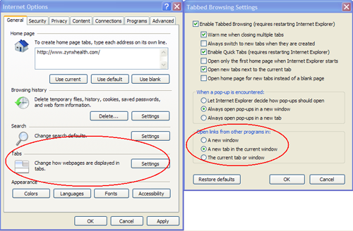 Set Internet Explorer to open links from other programs in a new tab in the current window: